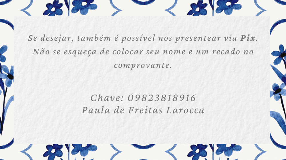 Caso deseje nos presentear, na aba “Lista de Presentes”, você encontrará sugestões simbólicas, todos os presentes são fictícios. Se preferir, também disponibilizamos uma chave Pix na aba ''Outra Forma de Presentear''.